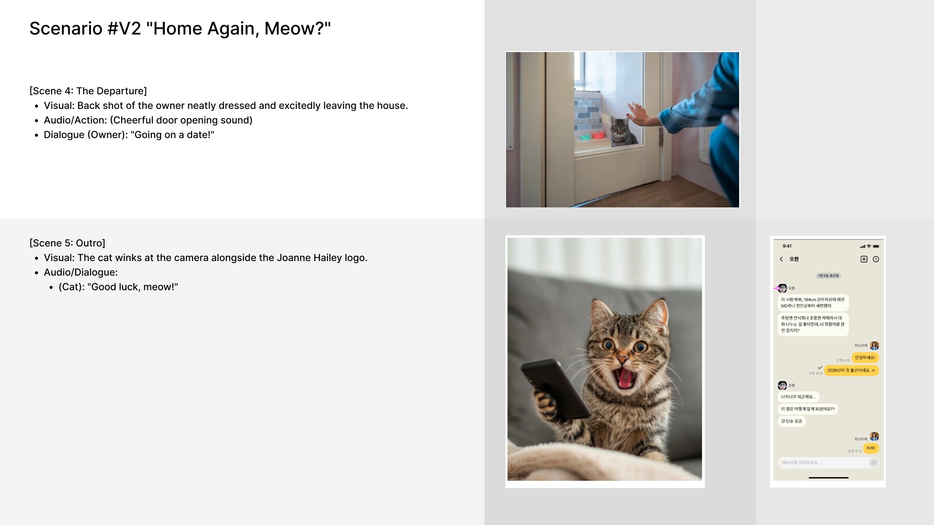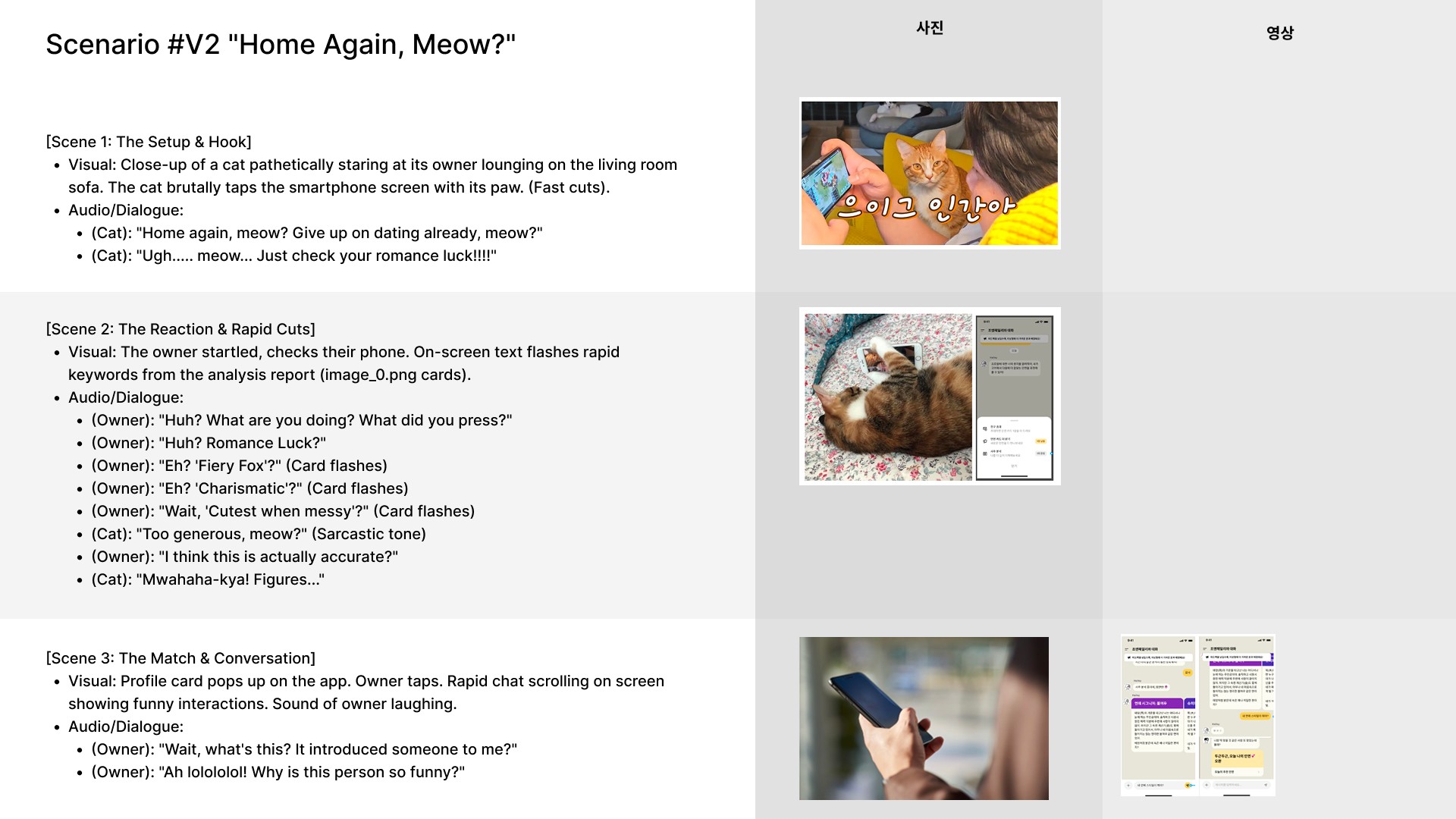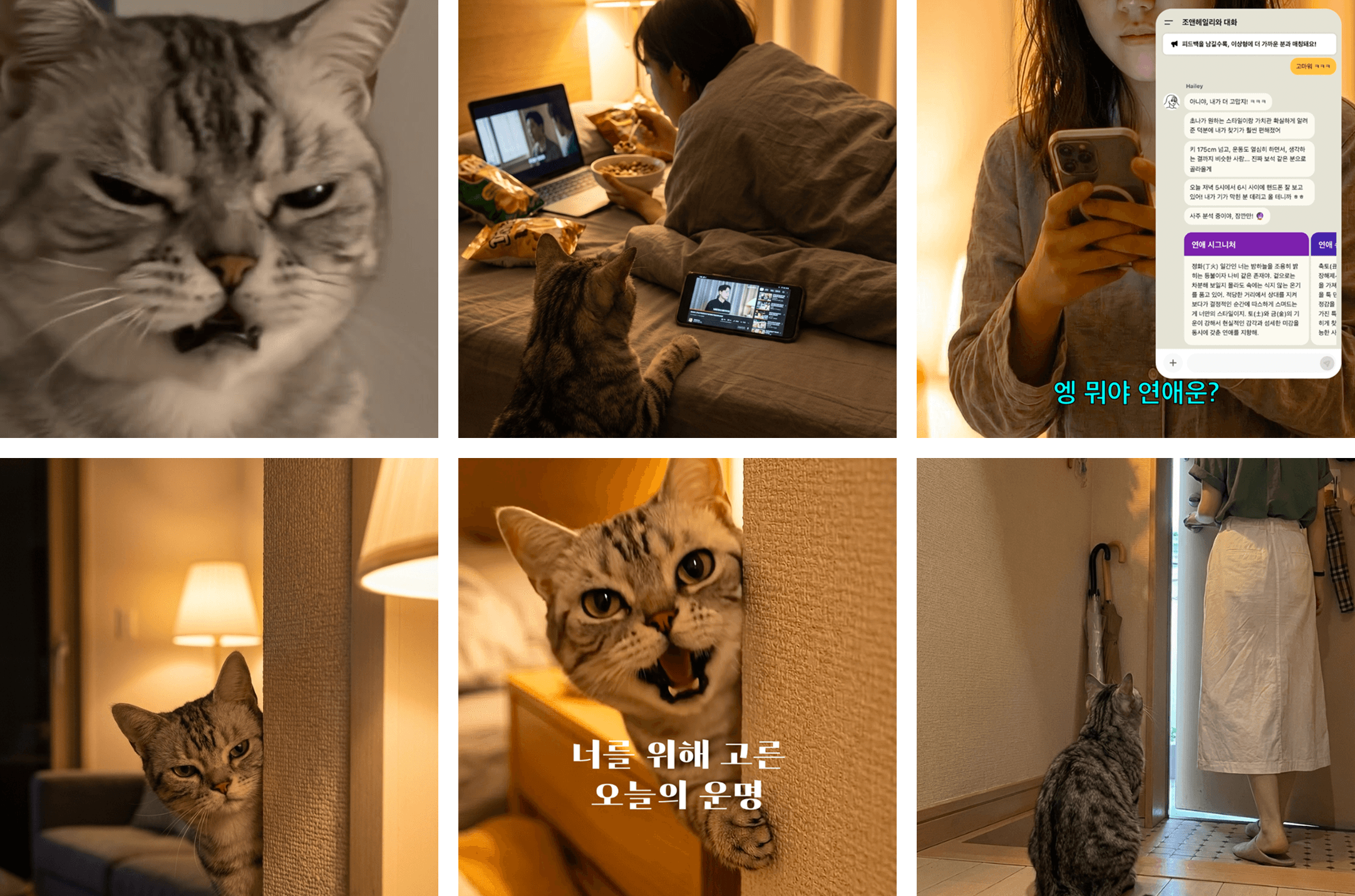 The Concept: A frustrated cat, annoyed by its single, homebody owner, takes matters into its own paws. The cat taps the "Romance Luck" button on the app, which leads to the owner finding a match, having a great conversation starter "My cat checked my Saju!", and finally leaving the house for a date.