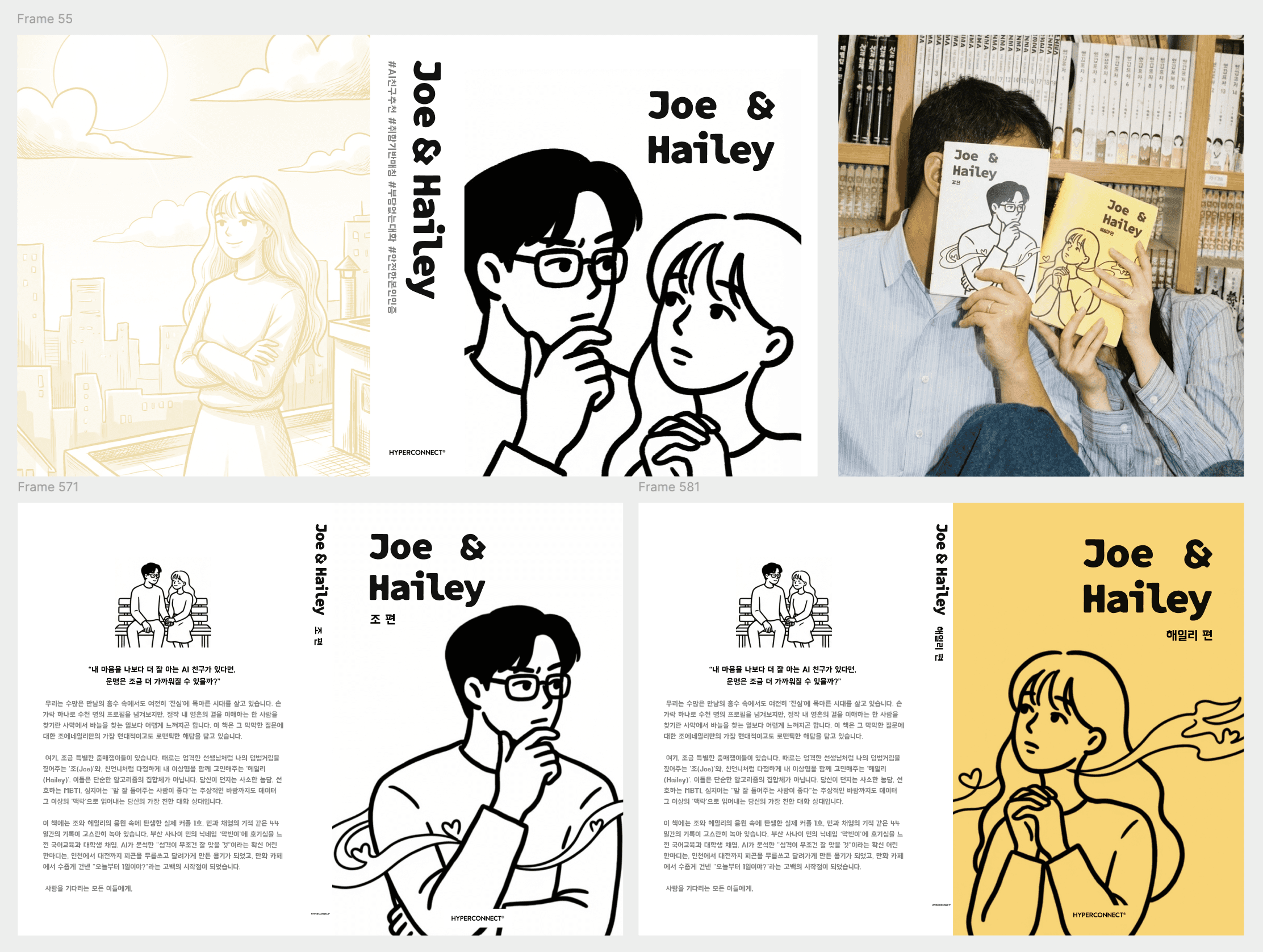 To solve both the IP issue at the Manhwa Cafe and the need for "objects" to hide their faces, I came up with a unified solution: I illustrated and designed physical "Joe & Hailey" branded book covers. By wrapping existing books with these custom designs, the couple could playfully hide their faces behind our brand assets. This solved the copyright problem, protected their privacy, and naturally integrated the AI brand into the real-world narrative.